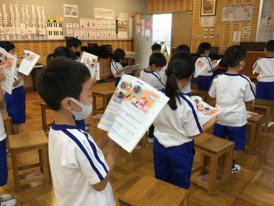 「♪TODAY」を伸びやかな声で歌っています。また、新しい曲「♪わくわくキッチン」の歌詞に注目して歌う時間を過ごしました。