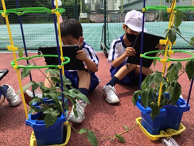 今回は、アサガオの観察です。本葉がたくさん生えてきました。また、つるがどんどん伸びてきて、鉢から出ようとしているものもあります。