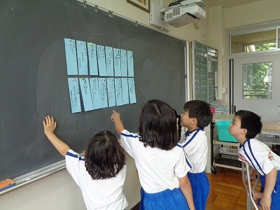 国語の学習で、俳句を書いていましたが、今日は自分の考えた夏の俳句を画用紙に書きました。その後、俳句チャンピオンを選びました。