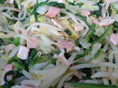 白菜とほうれん草、もやしのおひたしです。ほうれん草は冬が旬の野菜ですが、緑黄色野菜で栄養価が高いです。血液の成分になる鉄分や葉酸も豊富で貧血予防にもつながります。