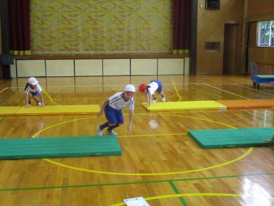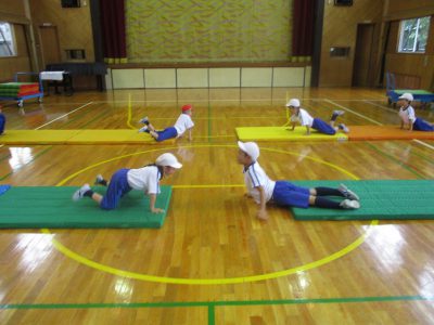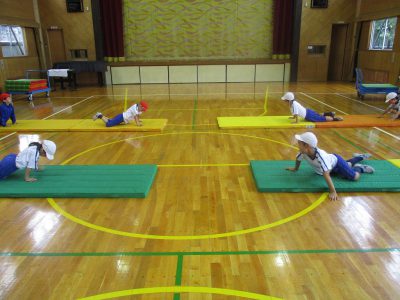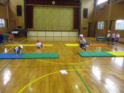 ウサギや犬、オットセイになり、マット運動を楽しんでいます。