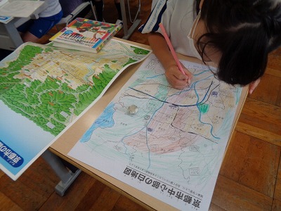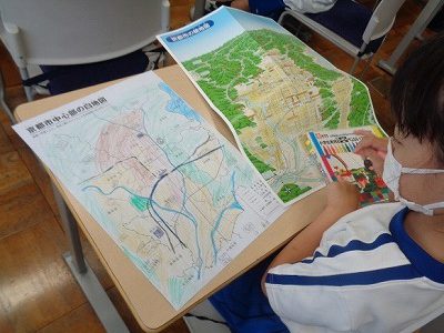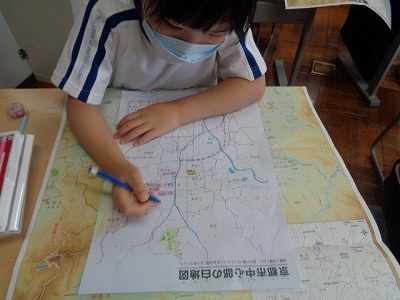 区域事に色で分けたり、地図記号を書いたり、有名な観光地を印付けしたり、自分のお家もマップに記したり、川の名前を覚えたりと様々な活動を続けてきました。