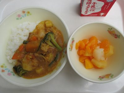 しっかり煮込んだカレーは、かぼちゃの甘さも溶け出して、おいしく仕上がりました。野菜はなるべく煮崩れしないように、調理してよく噛んで食べてもらえるようにと考えています。