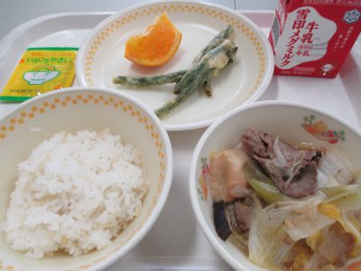 今日の献立は、「すきやきふう煮、三度豆の天ぷら、オレンジ、ふりかけ」でした。