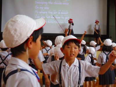 [There is .../ There are...] を使った文章の確認をしたり、セサミストリートの音読をしたりしました。その後、2年生が、先日の発表会で歌った「Bunkyo Elementary Schoolへ行こう」をみんなに紹介したり、先生役として、異学年とペアになって歌って踊ってくれたりしました。2年生、大活躍!