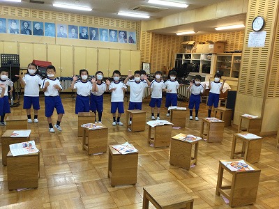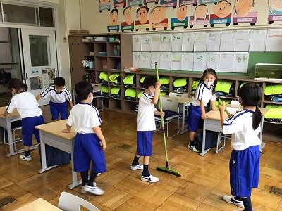 6年生が今日から修学旅行なので、1年生だけの掃除です。ほうき担当の人がテンポ良く、机の人に「1列目どうぞ!」と声をかけ、スムーズに進められていました。
