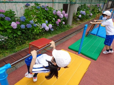 「一人で出来た」「鉄棒楽しい」などの言葉が聞こえ、達成感を子ども達と味わっています。
