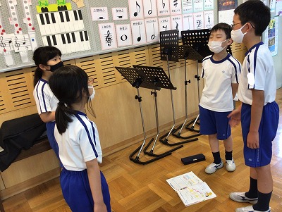 高い声のヤッホ-、低く長ーいヤッホー、飛び跳ねるようなヤッホーなど、各チームの音楽づくりは、もう少し続きます。