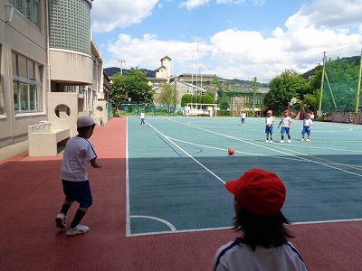 運動場に出て、キックベースです。