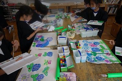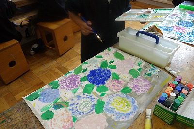入れ替わるように,造形室の机上にはみずみずしいあじさいが満開になりました。