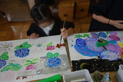 そんな「花の色が移りやすいこと,変化すること」は文教キッズにはむしろ魅力的なようで,微妙な色の変化の美しさを味わいながら,最後まで表現方法を工夫しながら活動することができました。