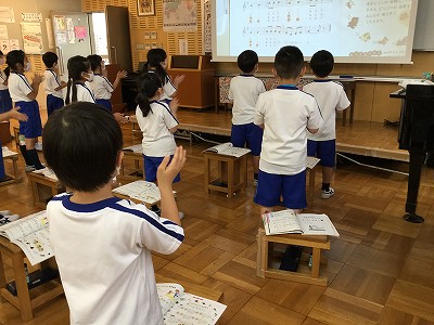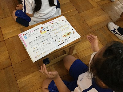 歌い方に慣れてくると、みんなで画面の歌詞に合わせて歌いました。