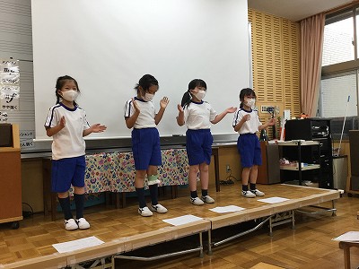 少しの時間、ステージに上がって、ミニ発表会を行いました。同じ生き物が現れると、「違う動物に変えようか?」と、さらに盛り上がっていました。