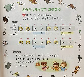 さて後半は、「どうぶつラップ」の時間です。教科書に、こんなにかわいく紹介されています。みんなから、思いつく動物を出し合い、「名前」「鳴き声」のラップのルールを確認しました。