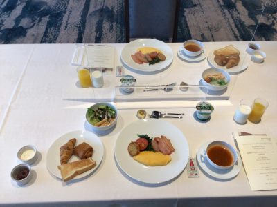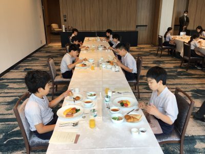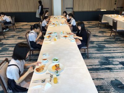 朝食会場に全員がそろって、朝の挨拶、同称十念で始まりました。