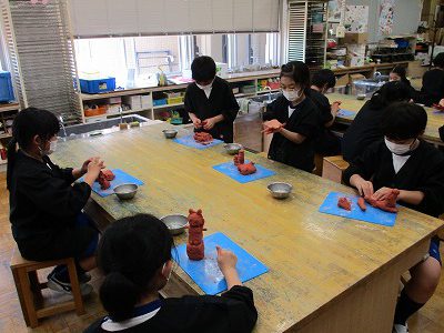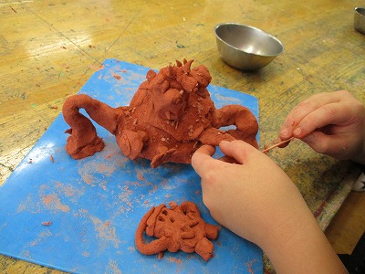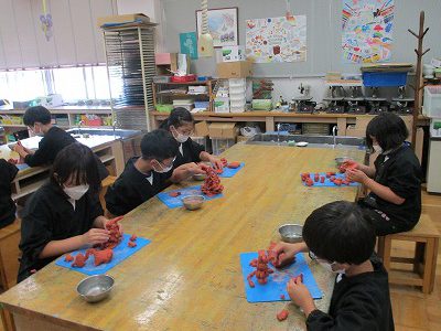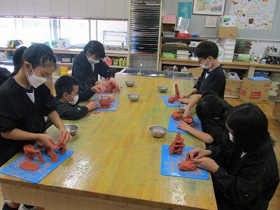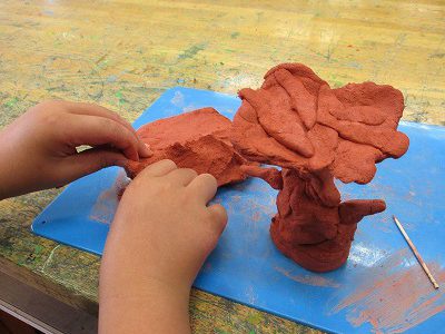 「立ち上がれ!粘土」というテーマで、土粘土の立たせ方や組み合わせ方を工夫して作品を作っています。
