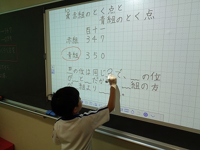 教科書の問題をもとに数の比較について考え、どのように判断したかを伝え合いました。