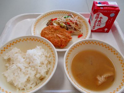 今日の献立は、「かぼちゃのコロッケ・ビーフンの炒め物・根菜のみそ汁」でした。