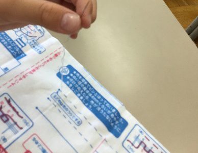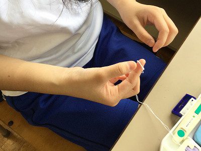 まずは、先週学習した“糸通し”から。針刺しに、針を刺したままで糸を通している友達がいました。針が安定するので、スーっと通せるようです。