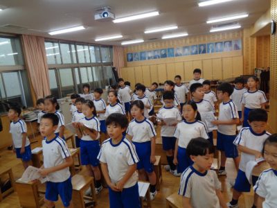 音楽授業では、近づく琵琶湖自然教室でのキャンプファイヤーの際に歌う定番ソングの練習も行いました。殆どがキャンプファイヤー未経験の子ども達は、キャンプファイヤーの説明をうけ、炎が大きくなるのを想像しながら歌いました。