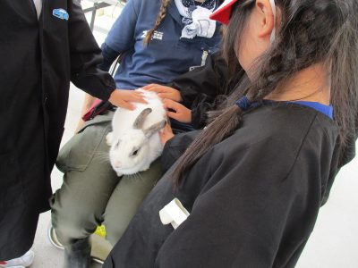 動物園の「なかよし教室」で、テンジクネズミの「やよいちゃん」とウサギの「こゆきちゃん」と触れ合うひとときを体験しました。