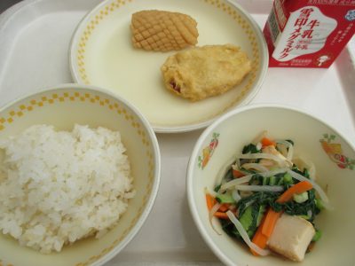 今日の献立は「いかの煮物、さつまいもの天ぷら、チンゲン菜のソテー」でした。
