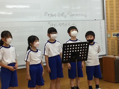 中間と終わりに、気づいたことや感想を送り合う活動を取り入れ、「ヤッホー」の音楽作りのまとめを行いました。