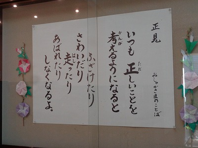 正見とは、物事をありのままに見る目を持つことです。そして何が正しいか自分でしっかり考えます。今、学校玄関に掲示してあります。
