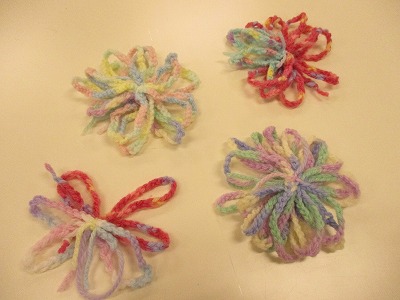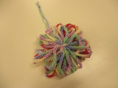 最後に、みんなで作った長いくさり編みの毛糸をつなぎ合わせ、カラフルな一つのたわしを完成させました。