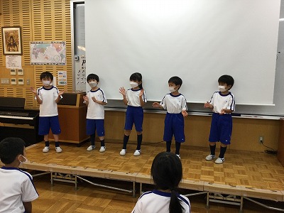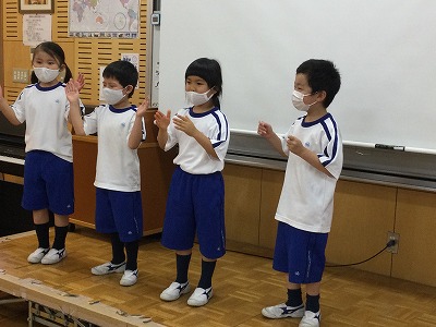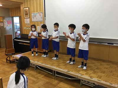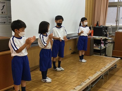 「♪わくわくキッチン」の「じゅうじゅうじゅう・」や「こねこねぽん・」をヒントに、言葉とリズム打ちを合わせた活動を進めています。少し難しい学習ですが、2回目の今日は、チーム毎に発表する時間がもてました。