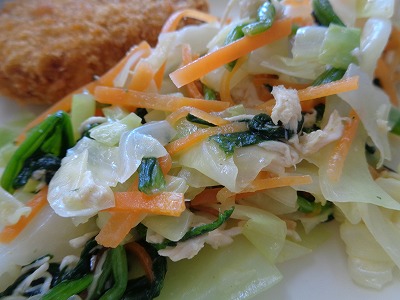 キャベツのカレー和えは、キャベツ、ほうれん草、人参、鶏のささみを合わせています。