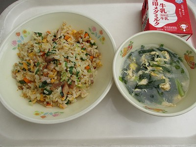 今日の献立は「五目チャーハン、卵とニラのスープ」でした。