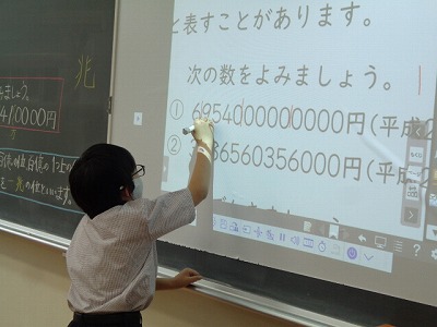 1の位から順に数える方法、4桁ずつ区切る方法など、はやく正確に読む方法をみんなで考えました。