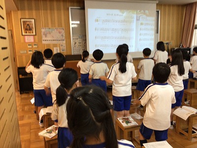 今日は、教科書に紹介されている日本語での歌を練習したあとに、仕上げの歌唱を行い、さらに“4拍子の指揮”付けて歌おう!という内容です。