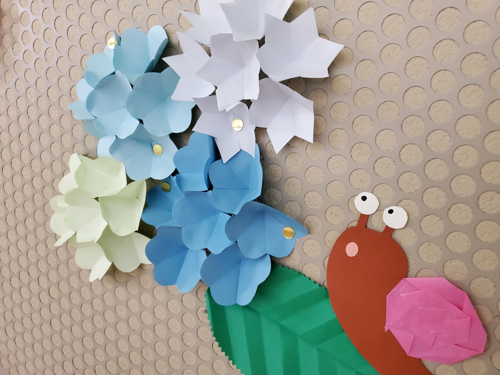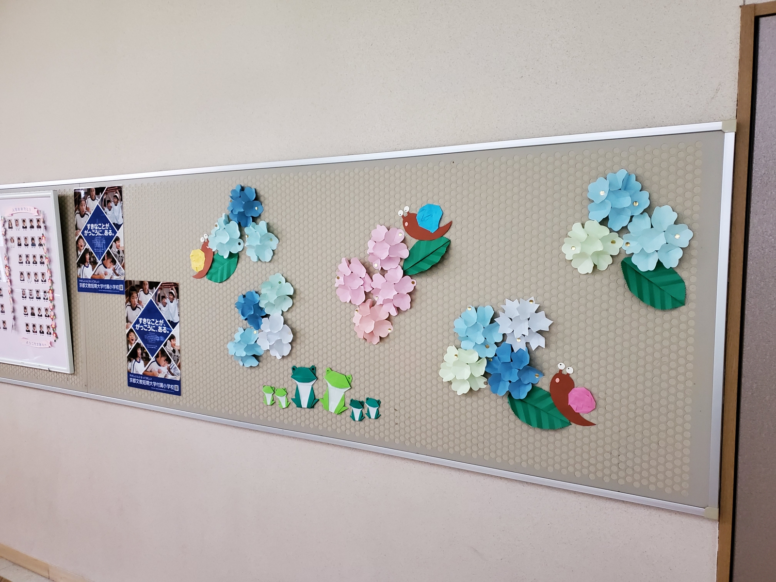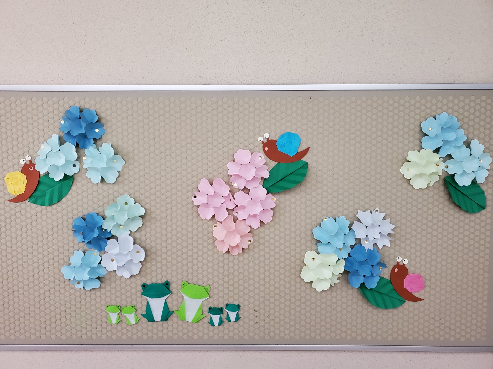 6月にぴったりの掲示。いろとりどりの あじさいがいっぱい!