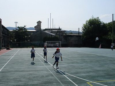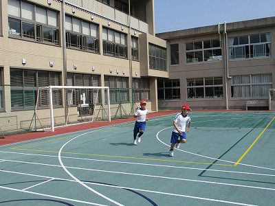 熱中症対策をしながら、マラソンは小学校のグラウンドを軽めに走っています。
