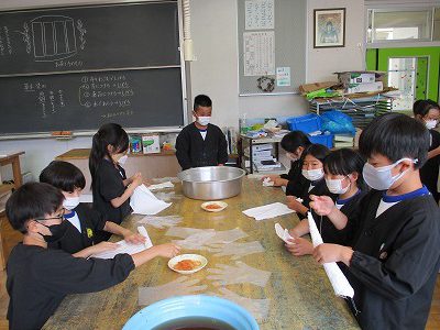 発表テーマの「お茶」に合わせて、図工でも「お茶」を使った染色に挑戦です。