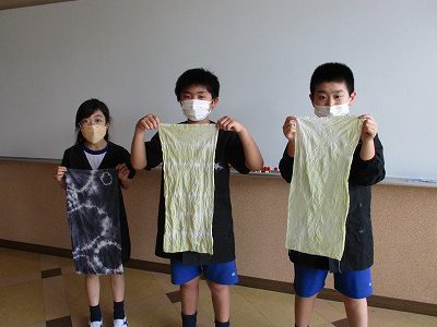 今回はシンプルに輪ゴムを使った「絞り染め」を行いました。