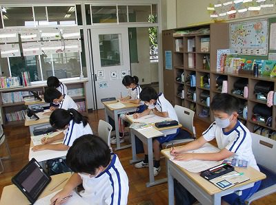 「新聞を作ろう!」の学習で、下書きが完成した人からお清書に入っています。