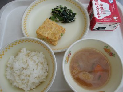 今日の献立は「千種焼、小松菜の炒め煮、油揚げの味噌汁」でした。