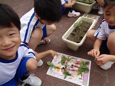 今日は、生活科の学習を予定していませんでしたが、時間割を変更し、一校時に二十日大根の収穫&観察を行いました。
