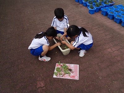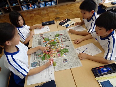観察の観点(目、耳、鼻、口、手)や葉っぱの長さ・数・大きさなどの点から気付いたことを、発見カードに記録しました。