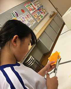 6年生が、“ピンキングばさみ”で不織布の周りを飾り切りし始めると、ミシン待ちのみんなも“ちょきんちょきん”と、ピンキングタイム・・・