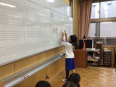 次は、リズム学習の時間。“4拍(はく)”の中で“タン”や“ウン”を並べ替えたリズム遊びを紹介しました。