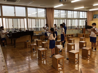 「♪ハローシャイニングブルー」の二部合唱練習に取り組んでいます。