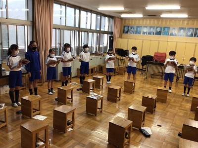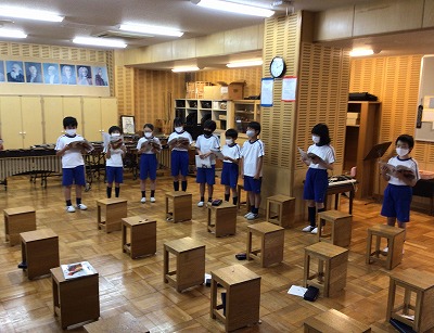 しかし、マスク着用中の今は、100%の歌声は出せません。高い音域だからついつい力を入れてしまいがちです。「ソフトな感じで歌ってみましょう」と声をかけ、初合唱を行いました。