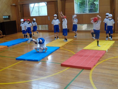 前転、跳び前転、後転、倒立前転、開脚前転、開脚後転、側転から2つ選び組み合わせて披露していました。