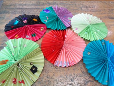 その上に千代紙を散らしたように装飾し、さらに、それぞれの作品を紐でつないで、大きな作品を仕上げます。