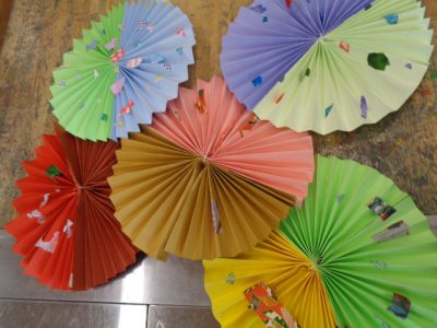「和」風になるよう選んだ2色の画用紙をじゃばら折りしてつなぎ合わせて円にします。