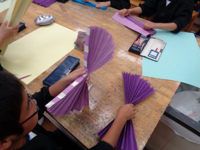 今日の図工科授業でも、ステージ背景の装飾作りを行いました。京都の世界遺産を紹介するという発表内容に合わせ、「和」のイメージでの背景づくりです。